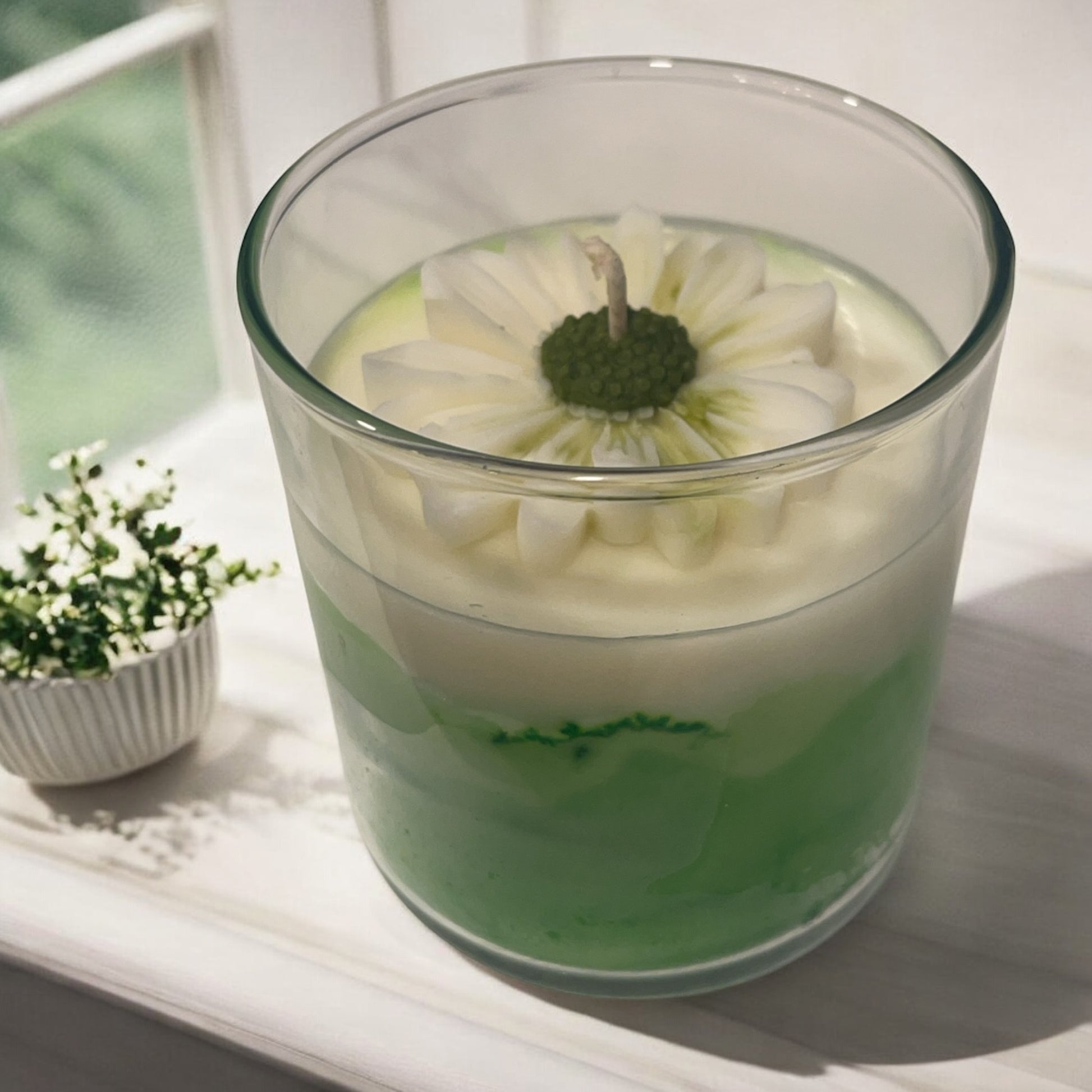 Fresh Bloom: A vibrant blend of green and cream coconut soy wax, topped with a delicate flower and infused with the uplifting fragrance of persimmon citron—a celebration of nature’s purest beauty.