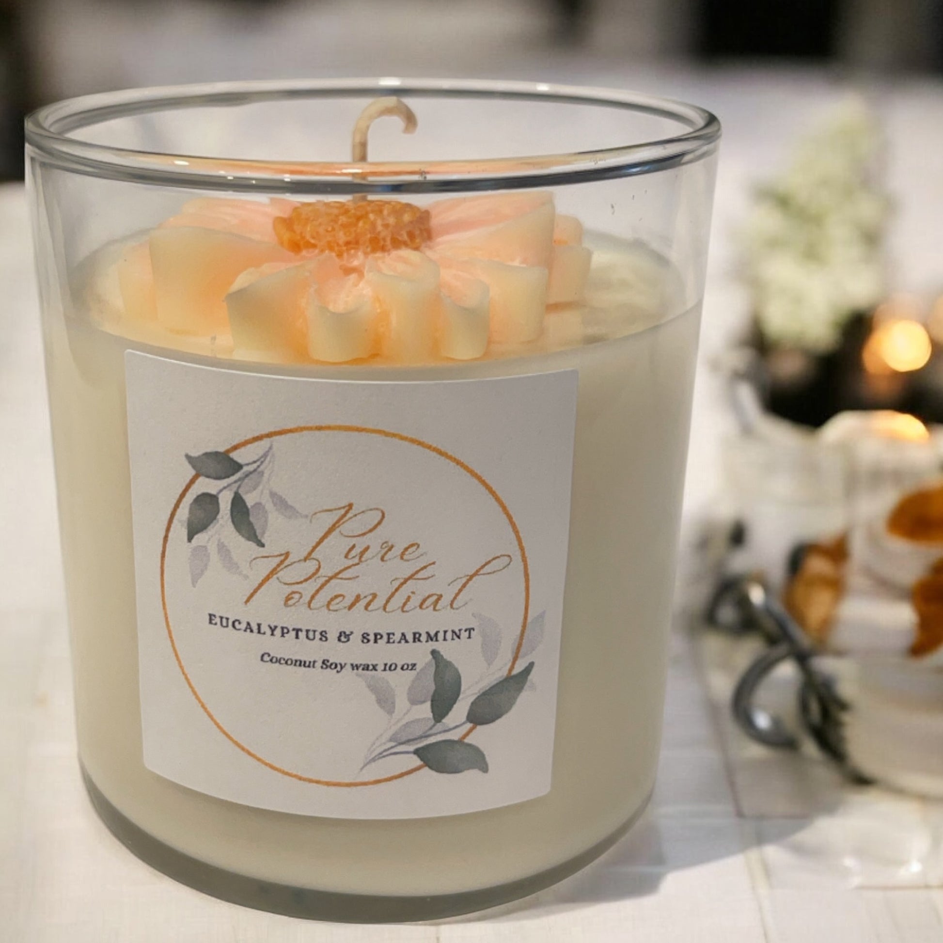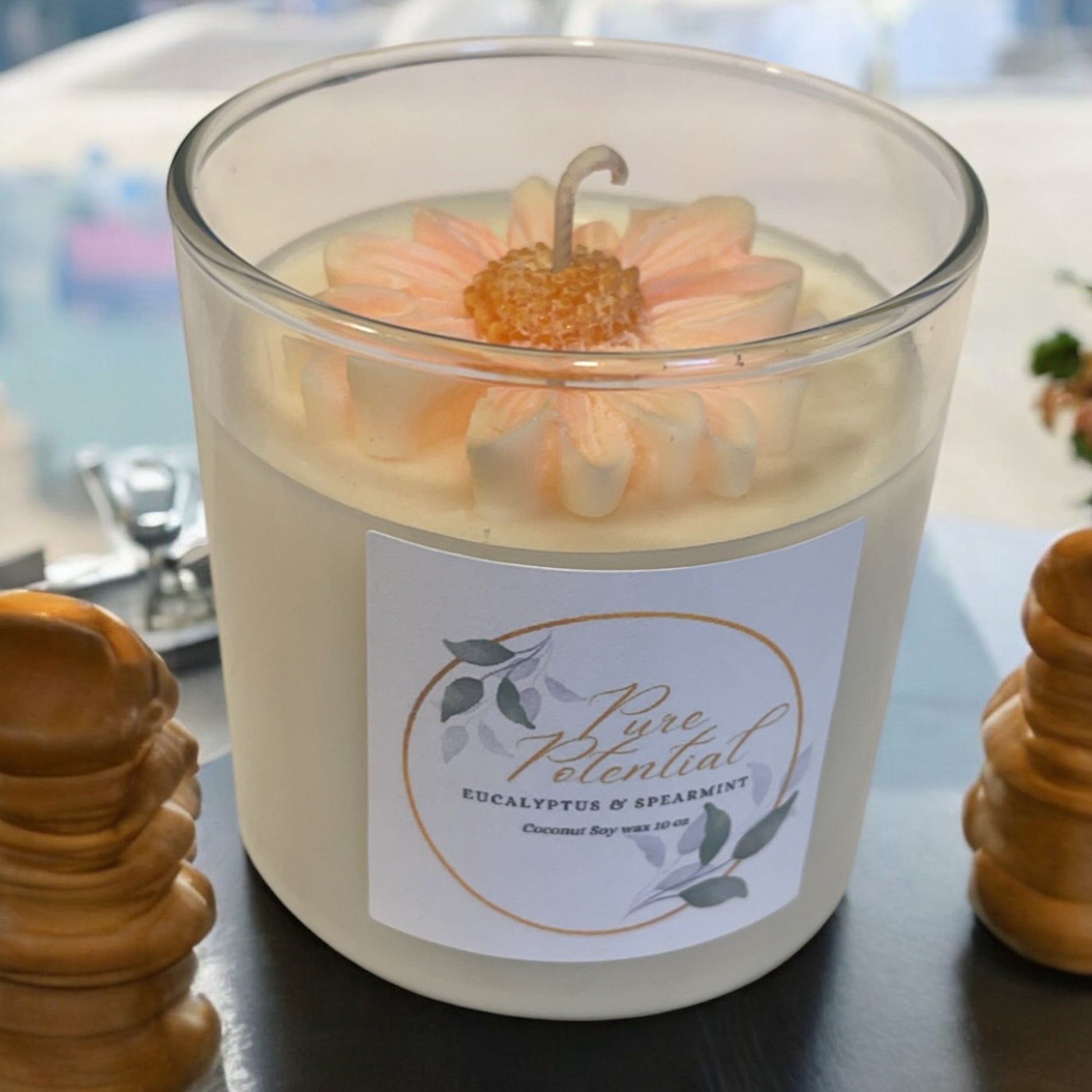 Pure Potential: Light yellow and peach coconut wax infused with eucalyptus and spearmint, topped with a delicate flower—a refreshing symbol of limitless possibilities.